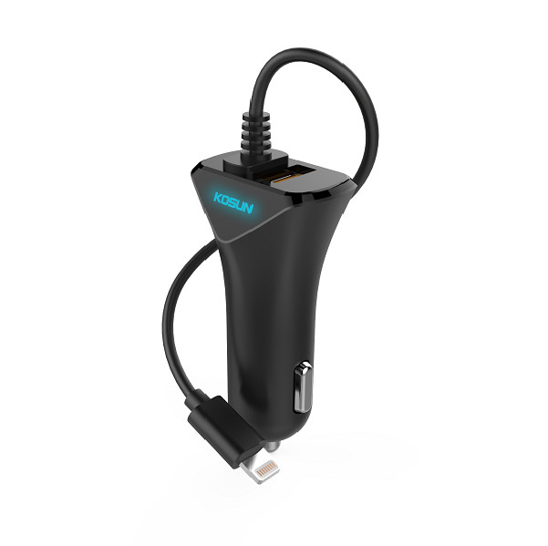Dual ports car charger with Smart IC 1A/2.4A with Cable,PC fireproof materials